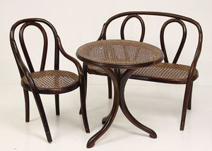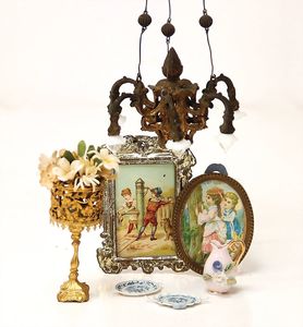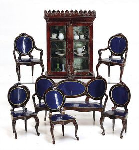 Biberacher Blech, Vitrinen-Schrank, 15 cm, mit altersbed. Lackabplatzern, einige Teile Glas, 1 Bank, 1 Armsessel, 4 Stühle