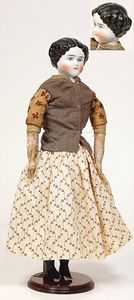 Papiermaché-Brustblattkopf-Puppe, 59 cm, braune Glasaugen, off. Mund, Lederkörper, farbl. teilw. etwas ausgebessert, ca. 1860