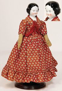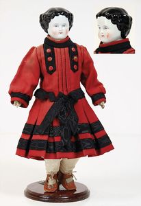 Puppe, China Head, glasiertes Porzellan, 41 cm, fein ausmodellierte Haare, blaue gemalte Augen, geschl. Mund, tief heruntergezogenes Brustblatt, Stoffkörper, Holzarme, Biskuit-Beine, 1 Bein geklebt