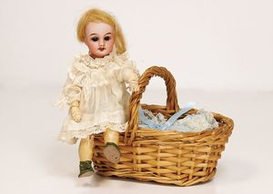 kl. Biskuitporzellankopf-Puppe, 19 cm, Kurbelkopf, braune Schlafaugen, off. Mund, oben Zähne, Gliederkörper stark bespielt, mit Masse-Abplatzer, im Korb