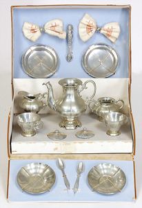 Koffer, Papiermaché, mit Zinn-Kaffeeservice, um 1900, H: Kanne 9 cm, Koffer L: 20,5 cm, schöne Puppendekoration