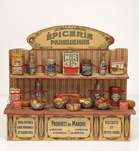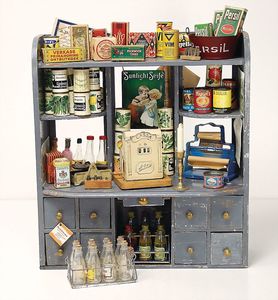 herrschaftl. Kaufladen, ca. 1890, 1,01 m breit, 48 cm hoch, Schubladen mit geschwungenen Blechschildern, fest eingebaute Regale, seitl. Spiegel, alte Tapete an Wand u. Boden, teilw. altersbed. verschlissen, reichh. Zubehör, sehr dekorativ