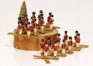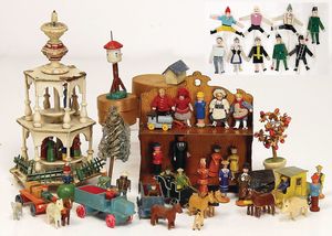 gr. Konv., Weihnachtspyramide, 17 cm, einige Hampelmänner, Winterhilfswerk, Gespanne, Figuren, Zubehörteile, evtl. Dekoration f. 1 Spielwarenladen