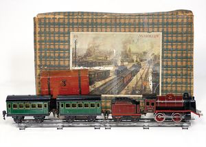 Spur 0, Zugpackung, bestehend aus R890, rot, schwarz, mit goldenen Zierlinien, Uhrwerk intakt, 2 Personenwagen, 1719, 2 Teile Gleismaterial, Kart. verschlissen, insgesamt bespielt