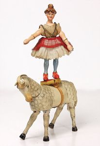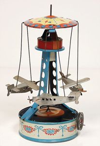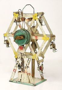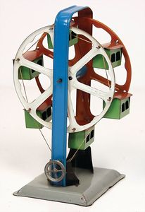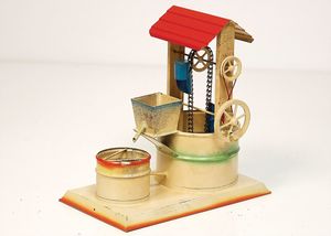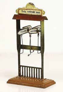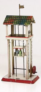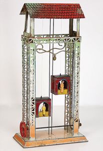 Antriebsmodell, Fahrstuhl, Blech handlackiert, 2 Figuren, 31 cm, guter Zust., mit kl. altersbed. Lackfehlern