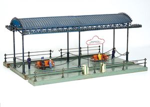 Grundplatte 53 x 38 cm, H: 25 cm, Bahnsteigüberdachung, 2-gleisig, Märklin, Spur 0, holländische Beschriftung, mit Figuren, schöner Orig.-Zust.