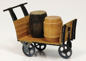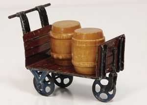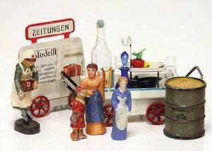 Konv. Eisenbahnzubehör, Kibri Zeitungswagen, Märklin Erfrischungswagen, Deckel u. Kleinteile fehlen, 2 Massefiguren, früher, 1 Märklin Fass