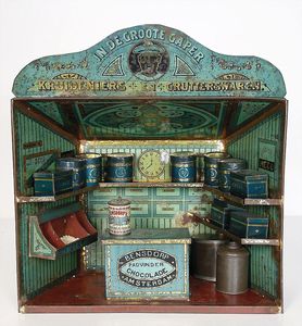 Bensdorp Schokolade Amsterdam, Schokolaterie, Holland, Blech lithogr., ca. 1890, 37 cm breit, 40,5 cm hoch, Orig.-Dosen, altersbed. Lackfehler, Regale teilw. 1 x neu befestigt, absolut selten, sehr dekorativ