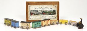 feine Eisenbahn, Holz, mit lithogr. Papier beklebt, Zinnräder, H: der Lok 7 cm, ca. 1840, Orig.-Holzkiste mit bunt lithogr. Deckbild