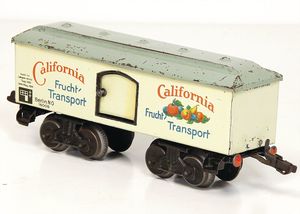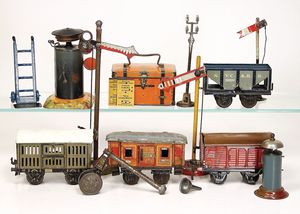 Fundkiste, Märklin Spur 0, gedeckter Güterwagen, 2-achsig, Märklin Sackkarre, dazu 2 Läutewerke, Signale, Hersteller?, 1 Koffer, Blech lithogr., Ladegut f. gr. Blechauto, 1 Bing Gepäckwagen, Viehwagen, Schüttwagen