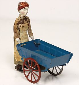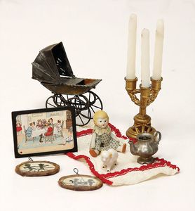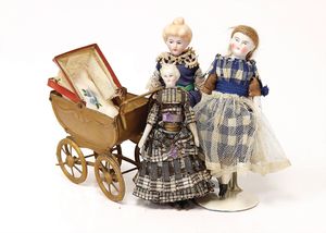 Puppenstubenpuppe, Biedermeier, Biskuit-Brustblattkopf, Holzkörper, 10 cm, Puppenstubenpuppe, Haushälterin, 12,5 cm, 1 Stubenpuppe, 12 cm, 1 Kinderwagen, Blech