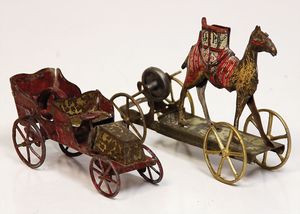 2 Teile, wohl Hess, Limousine, 9 cm, Kamel, 10 cm, mit Schwungradantrieb, Zinnräder, altersbed. Lackfehler
