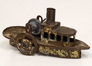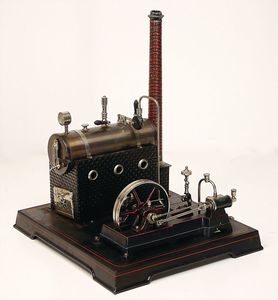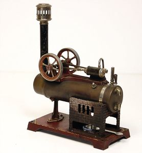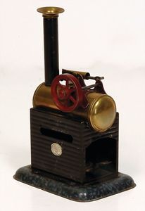 kl. stationäres Lokomobil, 21 cm, Kesseldurchm. 5,5 cm, Brenner ergänzt, Wasserstandsglas fehlt, Pfeife, Schornstein, bespielt