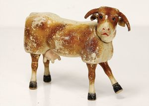 Humpty Dumpty, gr. Serie, Kuh, 21 cm, Schwanz fehlt, mit Glasaugen, mit Metallknopf, bespielt, Orig.-Zust.