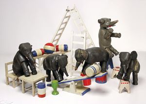 Humpty Dumpty, gr. Serie, Elefantenparade, 5 Elefanten, mit Glasaugen, 1 Elefant mit Rüsselspitze, bei den anderen Elefanten fehlt diese, teilw. mit Stoßzähnen, bespielt, mit Zubehör