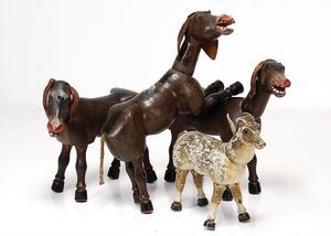 Humpty Dumpty, gr. Serie, 4 Teile, 3 Esel, mit Glasaugen, 1 Lama, gr. Serie, Glasaugen, mit Metallknopf, bespielt