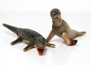 Humpty Dumpty, gr. Serie, Konv. 2 Teile, Krokodil, Glasaugen, Lederflossen fehlen, Seeelefant, gr. Serie, Glasaugen, Farbe abgerieben