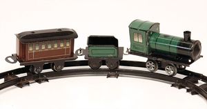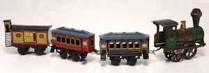 Storchbeinlok, Spur 0, Blech lithogr., ohne Tender, dazu 2 Personenwagen, Spur 0, Hersteller?, 1 gedeckter Güterwagen mit Bremserhaus, Orig.-Zust., mit altersbed. Lackfehlern an der Lok