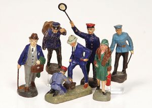7,5 cm, Masse, Bahnhofsfiguren, 6 Teile, Mann mit Ölkanne, Schuhputzer, Passanten, Bahnsteigpersonal, Zust. 2