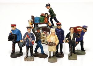 7,5 cm, Zeitungsverkäufer, Imbissverkäufer, Bahnpersonal, dazu 1 Figur mit Bahnsteigkarre, 5,5 cm, Zust. 2
