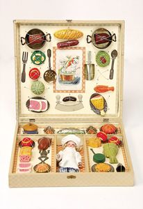Kochset, Frankreich, mit kl. Biskuitporzellan-Kurbelkopf-Puppe, 13,5 cm, Masse-Gerichte, Kochgerätschaften, Orig.-Holzkiste mit bunt lithogr. Deckbild