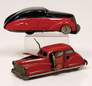 1010 Wendeauto, U.S.-Zone, 2-farbig, leicht bespielt, guter Zust., Uhrwerk intakt, dazu 1 Fahrzeug mit heraustretendem Fahrer u. sich öffnender Motorhaube, Frankreich, 13 cm, Uhrwerk defekt, bespielt