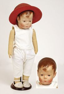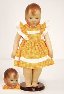 Puppe Nr. 1, 42 cm, Stoffkopf, 3 Hinterkopfnähte, schöne Bemalung, ein wenig Farbabrieb auf der Nasenspitze sowie der vorderen Locke, breite Hüfte, separat abgenähter Daumen