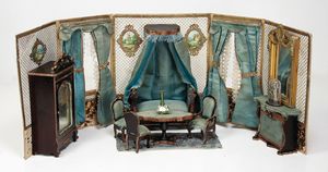 herrschaftl. Kl. Puppenstuben-Faltgehäuse, Frankreich, Höhe 23,5 cm, möbliert, Sitzgruppe, Bett mit Himmel, Schlafzimmerschrank, etc., sehr dekorativ