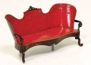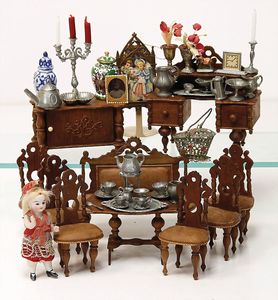 Puppenstubenmöbelprogramm, ca. 1890, Sekretär, Sitzgruppe, Schrank, reichh. Zubehör, Sofa, Breite 12,5 cm, 1 Ganzbiskuit-Puppe