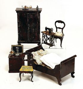 Biberacher Blech, Bett, 11,5 cm, Kleiderschrank, 14,5 cm, 2 Stühle, Nachttisch, dazu kl. Nähmaschine, Blech lithogr.