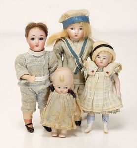 4 Teile Puppenstubenpuppen, Kewpie, Ganzbiskuit, 7,5 cm, Mädchen, mit bewegl. Kopf, Arme u. Beine, 11 cm, 1 Mädchen, Biskuitkopf, Massekörper, 14 cm, 1 Junge, Glasaugen, 13 cm