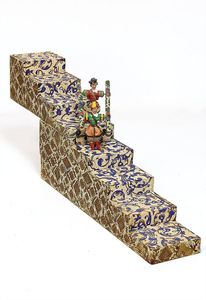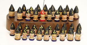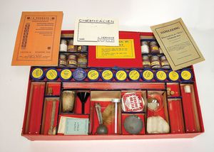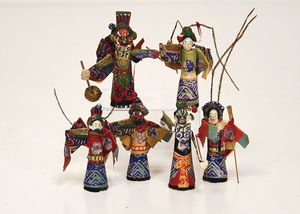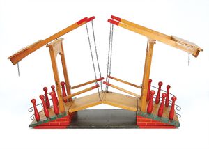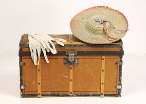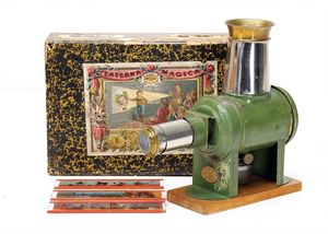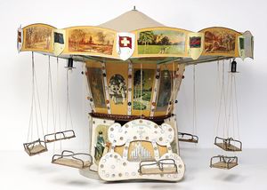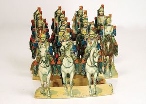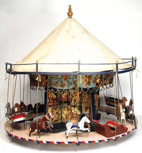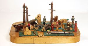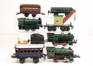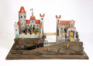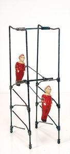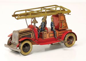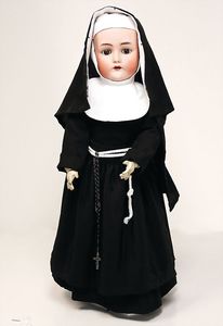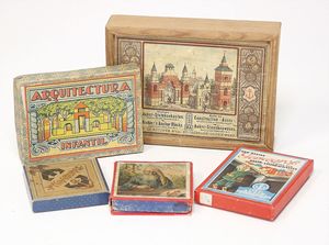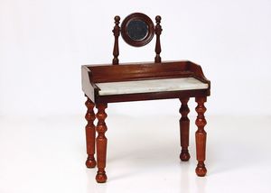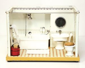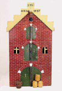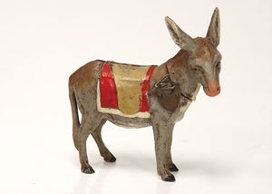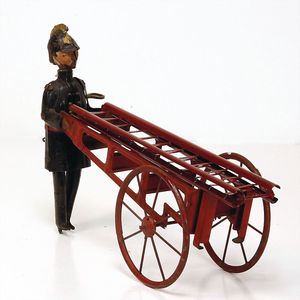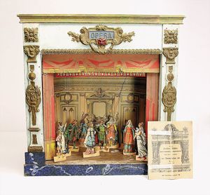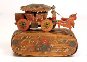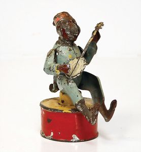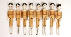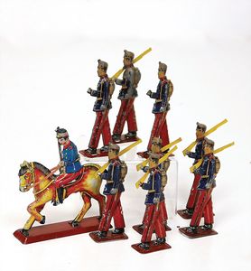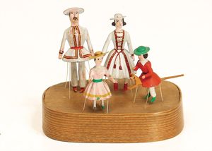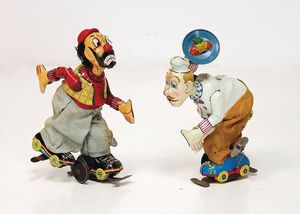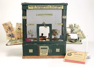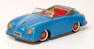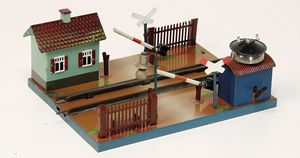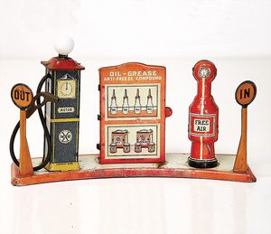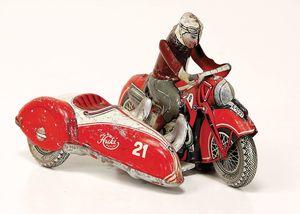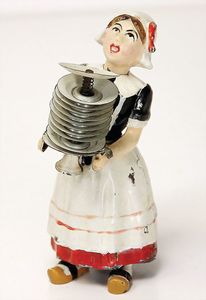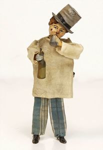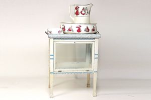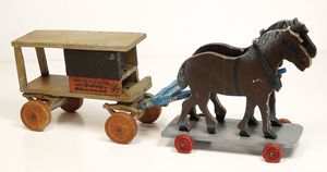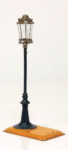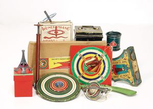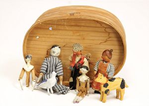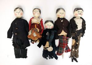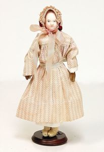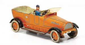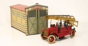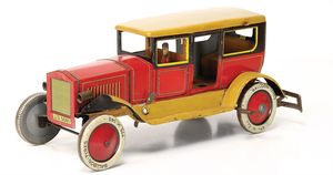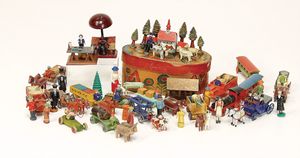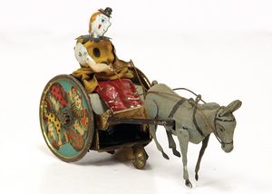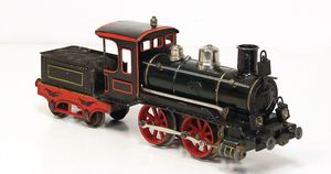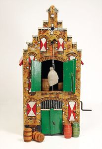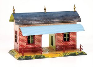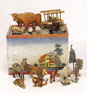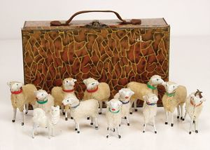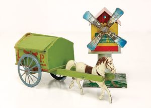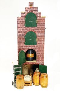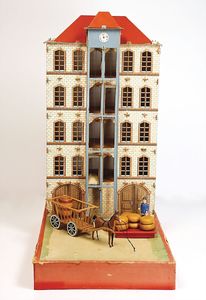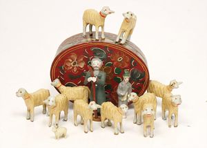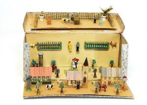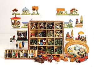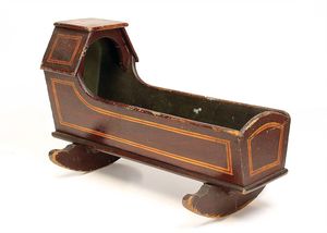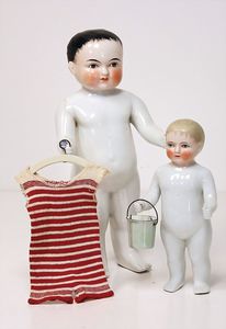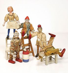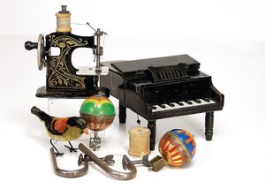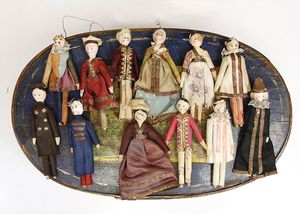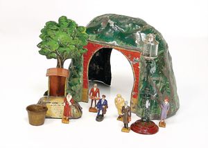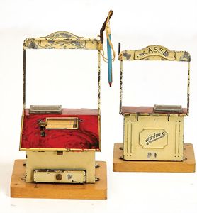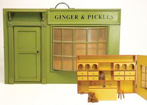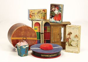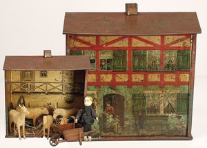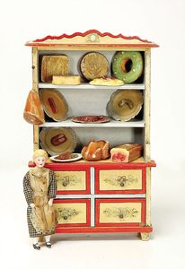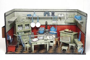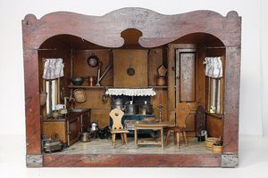frühe Puppenküchen, mit Innenbemalung sowie seltener Außen-Blechablage, 69 cm breit, 40 cm tief, 28 cm hoch, mit reichh. Zubehör, frühe Zinnteller, 1 Petroleum-Ölkanne, 1 Puppenstubenpuppe, glasiertes Porzellan, Brustblattkopf, ausmodellierte Haare, lange Porzellan-Unterarme, ausmodellierte Schuhe u- Strümpfe, Stoffkörper, 18 cm, dekorativ, schöne Gr.