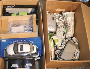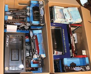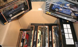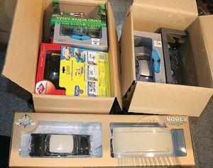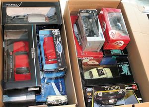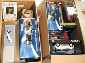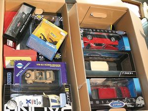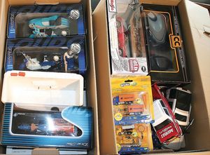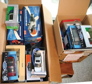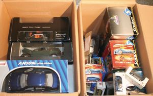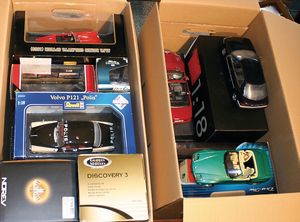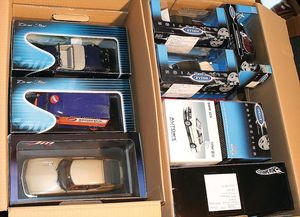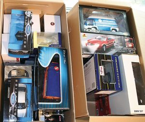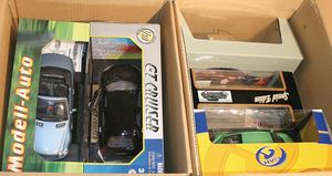 2 Kisten,, ca. 30 Automodelle, darunter auch leere Verpackungen ohne Inhalt, Marken wie Burago, Valley, Motormax, Modelle wie Porsche GT 3, Ford Street Car, alle im Orig.-Kart., guter Zust., diverse Maßstäbe wie 1:18, 1:24, 1:43