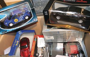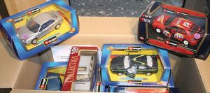 2 Kisten, mit 20 Automodellen, diverse Maßstäbe wie 1:16, 1:18, 1:21, Burago, darunter 2 Lego Modelle, Automodelle wie Ferrari GtO, Porsche 911 Carrera, VW New Beatle, alle im Orig.-Kart. bis auf die 2 Lego Modelle, guter Zust.