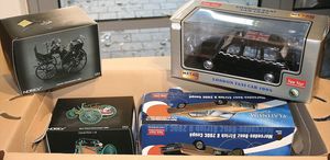 2 Kisten, ca. 18 Auto- u. Motorradmodelle, div. Maßstäbe wie 1:18, 1:16, teils bespielt, teils im Orig.-Kart., sonst guter Zust., Hersteller wie Car Collections, Ape, Modelle wie Mini, Dreiräder