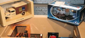 2 Kisten, mit 14 Modellautos, darunter 2 x Benz Patent Motorwagen, im Orig.-Kart., sonst Hersteller wie Santa, Autostar, Norev, Modelle wie Mercedes Benz, Citroen, im Orig.-Kart., guter Zust.