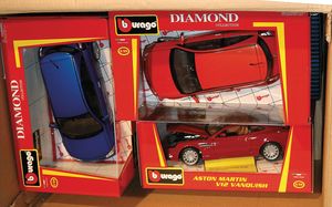 2 Kisten, mit 14 Modellautos, Riko, Valley, Maestro, Audi Quattro Coupé, Austin Martin, DB 9, Bord F 150, Maßstab 1:18, alles im Orig.-Kart., guter Zust.