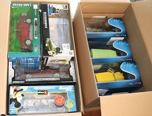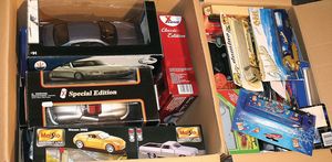 2 Kisten, mit 12 Modellautos, teil bespielt, teils guter Zust., alle im Orig.-Kart., einige Kisten ohne Inhalt, diverse Maßstäbe wie 1:18, 1:72, 1:55, Hersteller wie Maisto, Motormax, Hot wheels, Marken wie Maserati, BMW 745i, Peugeot