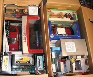 2 Kisten, ca. 20 Modellautos, darunter auch einige leere Kart., diverse Maßstäbe wie 1:18, 1:43, teils ohne Orig.-Kart., Hersteller wie Maisto, Collection Prestige, Solido, Modelle wie Peugeot, Corvette, einige Roller u. Motorräder, sonst guter Zust.