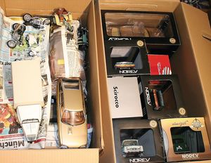 2 Kartons, mit ca. 25 Automodellen u. Motorradmodellen, teils im Orig.-Kart., teils ohne Kart., Maßstab 1:43, 1:18, verschiedene Fahrzeuge wie Dreiräder u. andere, Hersteller wie Norev, Mondo Motors, Modelle wie VW Scirocco, Mercedes Benz, Vesper, guter Zust.