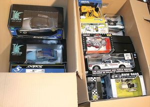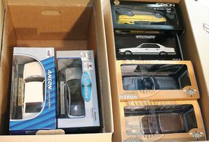 2 Kisten, ca. 24 Automodelle, darunter 1 Kran, 1 Jetski, alle im Orig.-Kart., guter Zust., Hersteller wie Revell, Norev, Bruder, Modelle wie VW Scirocco Gti, Mercedes Benz, diverse Maßstäbe wie 1:18, 1:16, 1:43