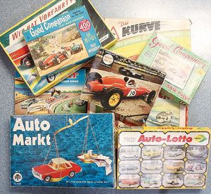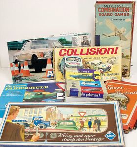 Konv. Verkehrspiele, teilw. unvollständig, oder nur Spielpläne vorhanden, darunter ,,Gib acht im Straßenverkehr", ,,Pass auf", ,,Das neue Verkehrszeichen", ,,Autobörse von Aral", ,,International Grand Prix", beides wohl komplett, ,,Die große Fahrschule", von Klee, ,,Monaco Grand Prix"