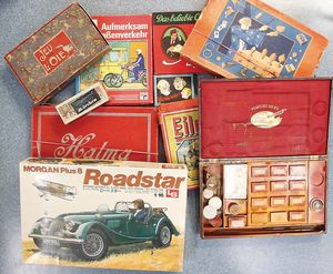 Konv. Gesellschaftsspiele, darunter ,,Jeu Di L'oie", altes Halma u. Mensch ärger dich nicht, 1 Holzkasten mit alten Schachteln u. Gefäßen mit Farbpuder, Aufschrift Peintur Soleil, 1 Kunststoffbausatz für einen Morgan Plus 8 Roadster, auf Vollständigkeit nicht geprüft, 1 Orig.-Klingelanlage für eine Puppenstube, unbespielt
