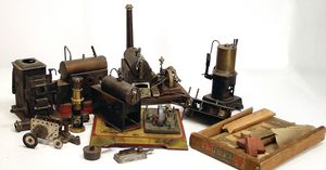 4 Dampfmaschinen, 2 x auf Holzsockel montiert, alles stark bespielt, Kleinteile fehlen (Ersatzteilspender), 1x stehende Dampfmaschine, dazu 1 Laterne Magica, mit Handkurbel, gem. Germany E.P. (Ernst Plank), nicht komplett, einige Steine für einen Ankersteinbaukasten u. anderes