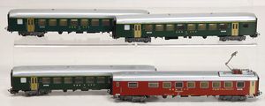 H0, 3 Teile, 346/1, Personenwagen 2. Klasse, grün, 2x 346/5, 4-Achsiger Postwagen, 346/2 Personenwagen, rot, guter Zust., mit kl. Spielspuren