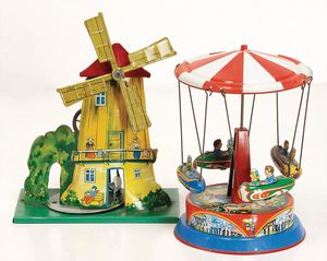 2 Teile Blechspielzeug, neuer, 1x Mühle, Dampfmaschine-Antriebsmodell, gem. Made in Germany WK, Höhe 18 cm, 1x Karussell, Höhe 16 cm
