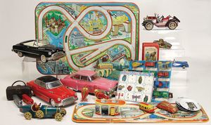 Konv. Blechspielzeug, Technofix Seilbahn, nicht komplett, 1 Achterbahn, Blech, Justra Mercedes 190 SL, stark bespielt, Flugrost, 1 Mercedes 300 SL, Japan, Blech, Batterieantrieb, guter Zust., Orig.-Kart., einige Technofix Fahrzeuge, 1 Motorrad Technofix 255, Rostfehler an 1 Rad, 1 3-rädiger Sportwagen, Guss, Bodenplatte Zinkpest, 1 Kleinwagen Kunststoff, restaurierungsbedürftig, einige Modellautos mit Fehlstellen, 1 Fahrzeug, Japan, 28 cm, Batterieantrieb, guter Zust., techn. nicht gepprüft, schönes Händlerkonv.