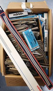 Konv. Gleismaterial, Märklin H0, Metall- u. Kunststoffgleise, gerade, gebogen, Weichen, guter Zust., bis bespielt, schöne Fundkiste, auch f. Händler