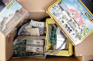 Fundkiste, einige Faller Häuser, teilw. gebaut, teilw. im Orig.-Kart., dazu 1 H0 Militärset elektric train set, H0, USA; sehr guter Zust., im Orig.-Kart., bitte besichtigen