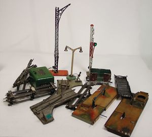 Konv. Eisenbahnzubehörteile zum Restaurieren, Bahnübergang, Lampen, Signale, etc., nicht komplett, dazu einige Teile Gleismaterial, Spur 0, Uhrwerk, 1 Märklin Transformator